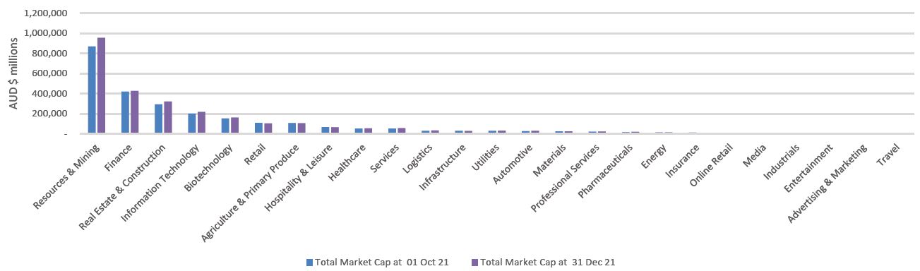 The table below shows ASX Listed Company Valuations by industry. Aggregated market capitalisation by sector shows industries increasing in comparison to the previous quarter demonstrating an increase in company valuation over the quarter.