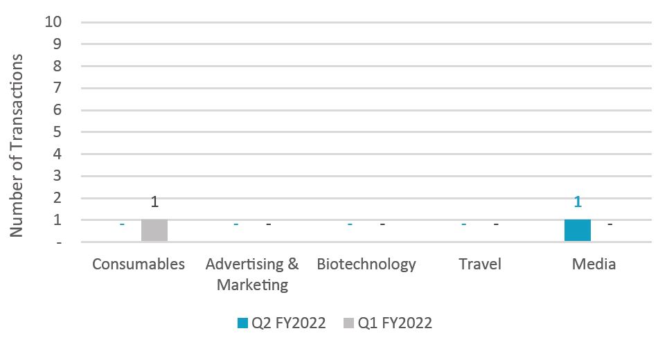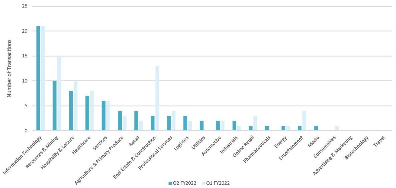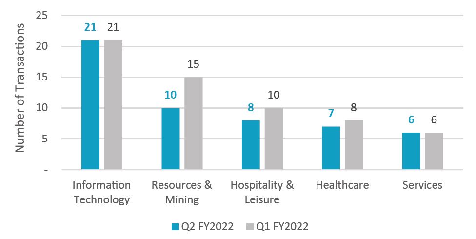 Information Technology takes the lead in the top 5 industries for Transactions in Q2 FY2022. The top 5 industries are all showing a flat to moderate decline in M&A deal volume over the quarter.